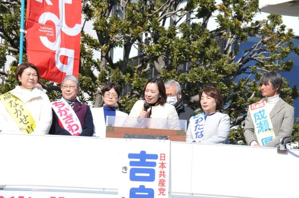 日本共産党の吉良よし子参院議員は24日、東京都町田市、日野市で街頭演説し、「差別と分断をあおり戦争へと続く自民党政治から、暮らしと平和、人権を守る政治に変えるため共産党を伸ばしてほしい。衆院東京ブロックで現有1議席から2議席へ前進を」と訴えました。両市議選(ともに2月8日告示、15日投票)の党各4候補、池川友一衆院東京23区候補も演説しました。