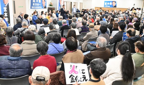 衆院選に向け、日本共産党の宮本徹予定候補(比例東京・20区重複)の事務所開きが24日夜、東村山市の市民センターで行われました。イメージカラーの青い横断幕が張られた会場には立ち見が出るほどの人が集まり、障害者の家族や地元の医師、市民運動の関係者、立憲民主党や無所属の自治体議員など、約20人が応援演説しました。