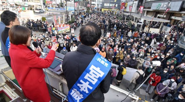 宮本候補は「平和を願い、立憲主義を守り、右傾化を懸念するみなさんの党派を超えた願いを日本共産党へ託してください」と述べました。辰巳候補は、自民党と連立政権を組んだ日本維新の会を批判したうえで「本物の改革政党、日本共産党の躍進を」と訴えました。