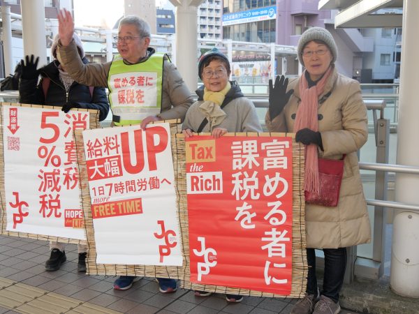 東京都大田区の北糀谷支部は29日、京急蒲田駅前で、プラスターを掲げて30分のスタンディングを行いました。