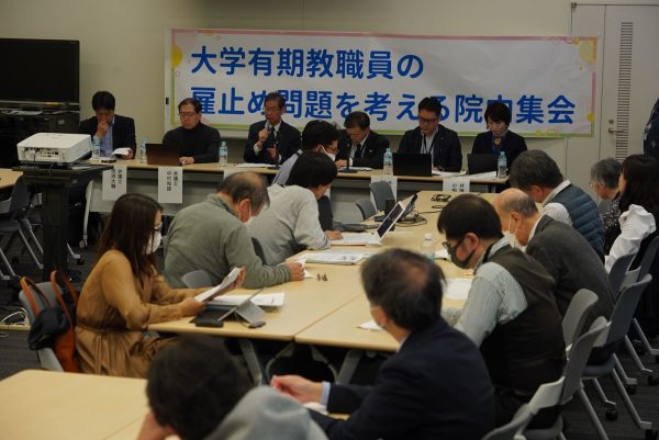 不当判決を受けた裁判当事者や労働組合は25年3月、参院議員会館で集会を開き、文科省見解の活用など打開策を議論しました。