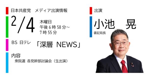 【メディア出演】2月4日(木)小池晃書記局長がBS日テレ「深層NEWS」に出演します 2026総選挙 2 2026-02-03 2月4日(木)18:58~BSフジ「プライムニュース」 内容: 衆院選 各党幹部討論会(生出演) 小池晃書記局長が出演します。ぜひご覧ください。