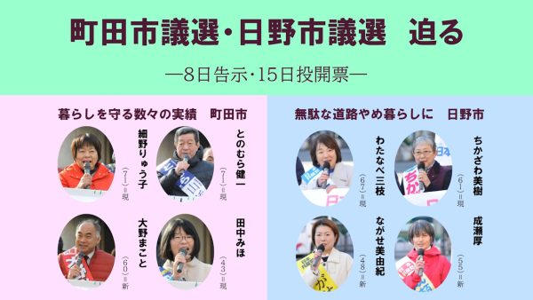 東京都町田市議選(定数36)は8日告示(15日投開票)されます。日本共産党は、とのむら健一(71)、細野りゅう子(71)、田中みほ(43)=以上現=、大野まこと(60)=新=の4候補を擁立し、現有4議席の確保を目指します。