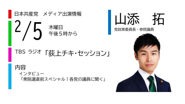 【メディア出演】2月5日(木)山添拓政策委員長・参院議員がTBSラジオ「荻上チキ・セッション」に出演します 2026総選挙 3 2026-02-05 2月5日(木)17:00~TBSラジオ「荻上チキ・セッション」 内容: インタビュー「衆院選直前スペシャル!各党の議員に聞く」 山添拓政策委員長・参院議員が出演します。ぜひご覧ください。