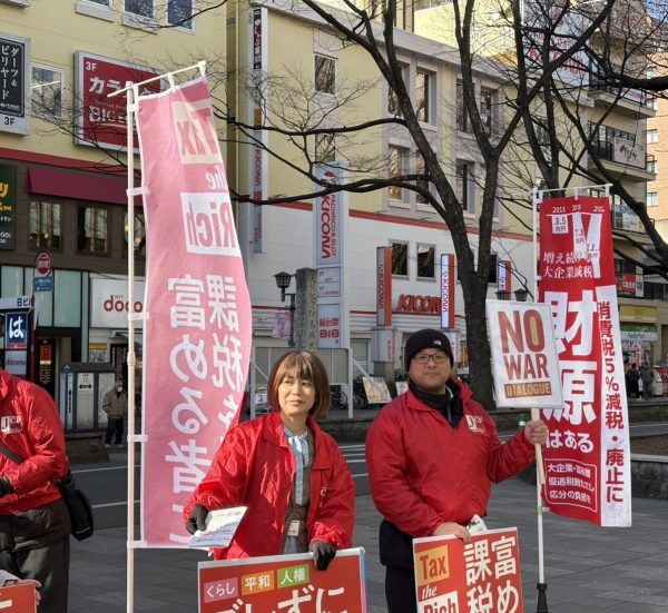からさわ地平・竹内ゆう子両市議は、朝夕に後援会員とともに赤いジャンパーを着て、府中駅周辺で「赤旗」号外を配布し、富裕層に公正な課税を求める「Tax the Rich」などと書かれたプラスターを掲げて宣伝しました。道行く人から「がんばってください」などの声が寄せられました。