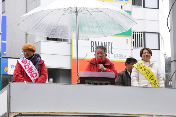 日本共産党の小池晃書記局長は11日、東京都日野市で行った街頭演説で、大激戦の市議選(15日投開票、定数24、立候補37人)で、ちかざわ美樹(61)、わたなべ三枝(67)=以上現=、成瀬厚(55)、ながせ真由美(48)=以上新=の党4候補の勝利へ「支持を広げてほしい」と呼びかけました。