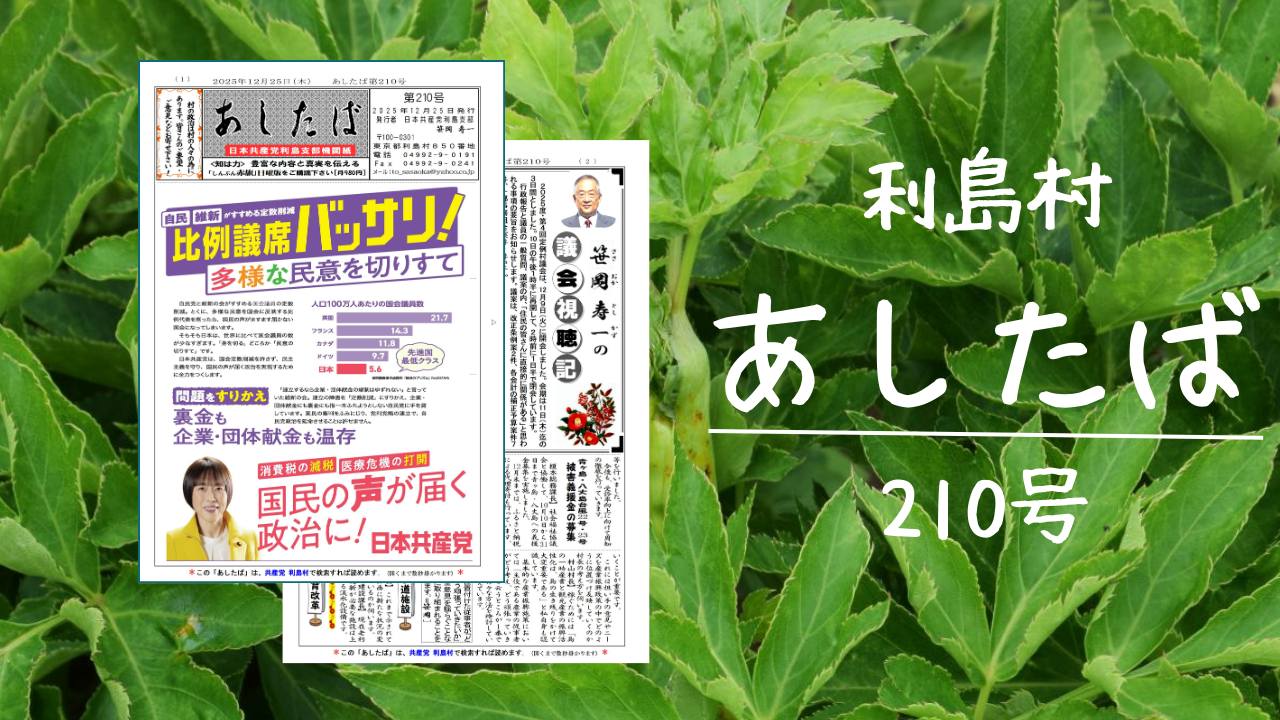 【利島村】「あしたば」第210号 ニュース 0 2026-02-13 日本共産党利島支部が発行する機関誌「あしたば」の最新号第210号(2025年12月25日発行)です。 国会や都政のうごきを伝える記事のほか、笹岡前村議の議会傍聴記などが掲載されています。ぜひごらんください。 「あしたば」21 0_ –ダウンロード