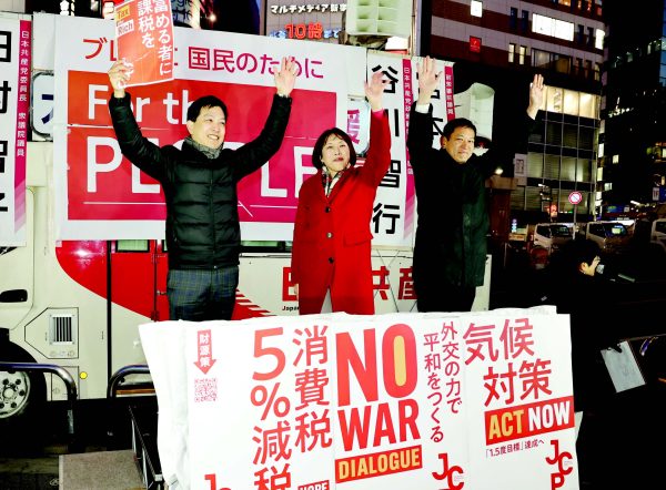 日本共産党は立憲民主党が公明党に取り込まれるなど、政治が右へ右へと流れるもとで、「憲法を真ん中にすえた共同」を呼びかけました。また、暮らし、平和、人権で「国民のためにブレずに働く」をキャッチフレーズに、大株主・大企業応援、米国いいなりの自民党政治の転換を訴えました。