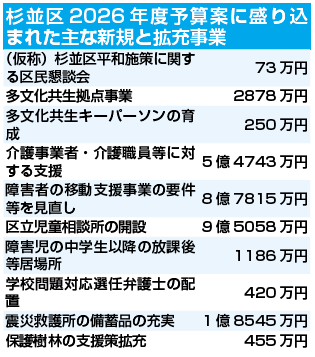 杉並区の岸本聡子区長は2日、記者会見で任期最後の編成となる2026年度当初予算案を発表しました。一般会計は今年度より79億2500万円(3・2%)増えて2535億2800万円です。予算編成で3つの重点の一つに、「区民の命と暮らしを守るための取り組み」を挙げ、平和への思いを世代を超えてつなぐ取り組みや、多文化共生基本方針の具体化、教育環境の拡充など、岸本カラーが強く出ています(表)。予算案は12日開会の第1回定例会で審議されます。