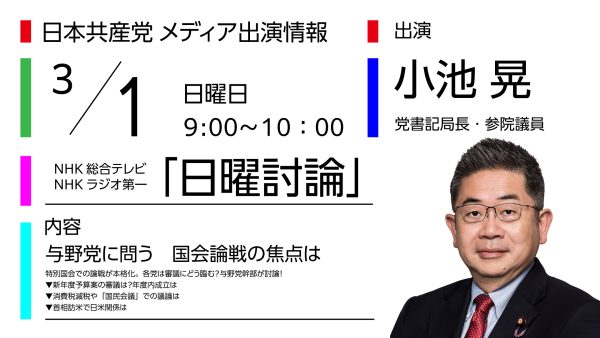 日本共産党からは小池晃党書記局長・参議院議員が出演します。
