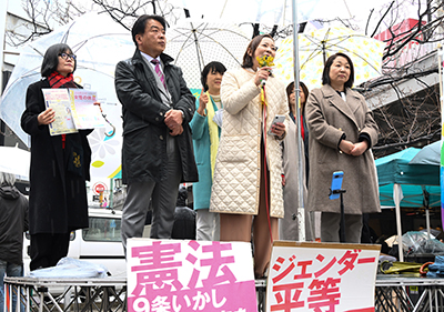 日本共産党の斉藤まりこ都議は、「アメリカとイスラエルによるイランへの先制攻撃は国際法違反だ」と批判。仁比聡平参院議員は、「富の集中にメスを入れ、男女の賃金格差の是正を」と訴えました。