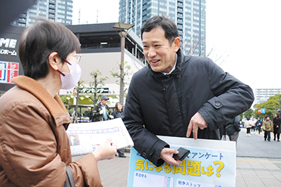 日本共産党の宮本徹元衆院議員は20日、東京都練馬区と江東区で党員・後援会員とともに、通りかかった人に政治への思いをシールアンケートで聞きながら「ストリート対話」に取り組みました。