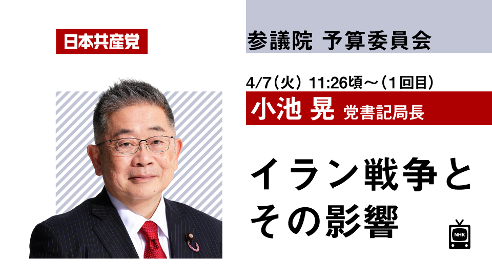 4/7(火)小池晃 党書記局長・参院議員が参院予算委員会で、午前と午後、2回質問に立ちます。