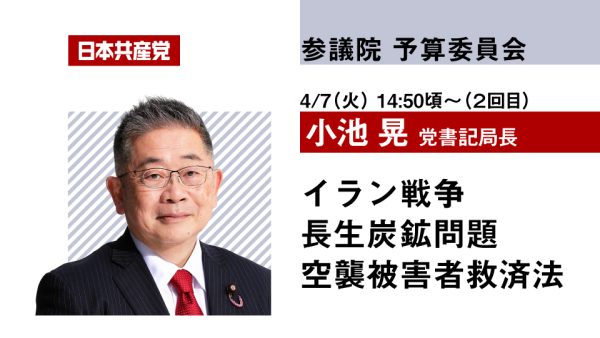 お知らせ4/7(火)小池晃 党書記局長・参院議員が参院予算委員会で、午前と午後、2回質問に立ちます。
