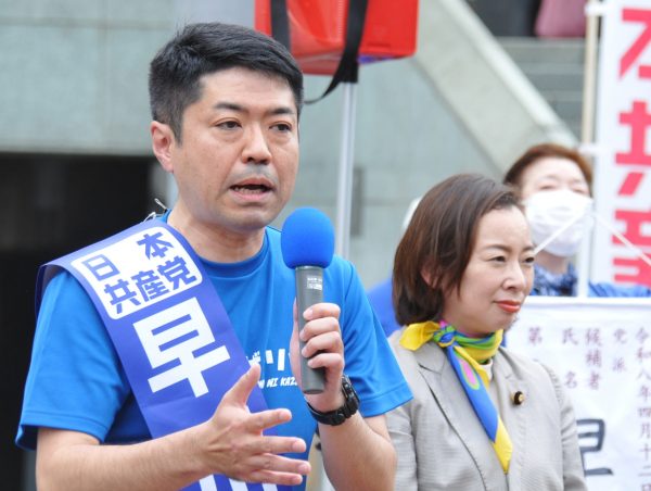 東京都多摩市議補選(12日投開票、改選数4、立候補10人)が告示された5日、日本共産党の早川かん候補(46)=新=は吉良よし子参院議員とともに第一声を上げ、「多摩市から戦争ストップの声を広げよう。市民の暮らしをとことん守る」と訴えました。