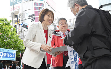 日本共産党は18日、東京・JR新宿駅東南口前で、憲法9条改憲に反対する緊急街頭署名宣伝に取り組みました。田村智子委員長と小池晃書記局長が「『戦争反対』の思いを、憲法9条を守れという署名に託してください」などと訴え、党本部の勤務員とともに市民と対話し、署名への協力を呼びかけました。