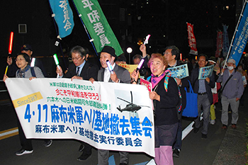 麻布米軍ヘリ基地撤去実行委員会は17日、東京都港区にある米軍ヘリ基地(赤坂プレスセンター)隣の都立青山公園で、同基地の撤去を求める集会とパレードを行いました。250人(主催者発表)が参加。ペンライトや、「憲法壊すな」「都心低空飛行ストップ」と書かれたプラカードを掲げ、「基地はいらない」などとコールしました。