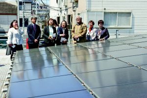 吉良議員らは、ソーラー発電による市民発電所を実践し、勉強会などを通じて江戸川電力の設立にも関わったNPO法人「足元から地球温暖化を考える市民ネットえどがわ」(足温ネット)の山崎求博事務局長の案内で視察し、住民参加の実践や課題について意見交換しました。