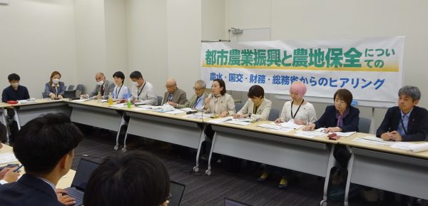 都市農業の振興と都市農地の保全について、東京農民運動連合会(武山健二郎代表)と日本共産党の吉良よし子参院議員、藤田りょうこ都議らは16日、農林水産、国土交通、財務、総務の4省からこの間の施策を聞き、農家の実情を示しながら施策の改善・強化を求めました。関係区市議が同席しました。