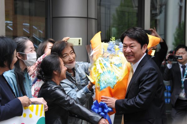 吉田氏は午前9時半ごろ、区役所に登庁。多くの区民が駆け付け、吉田氏に花束を手渡し、「がんばれ」「応援しています」などと声をかけました。