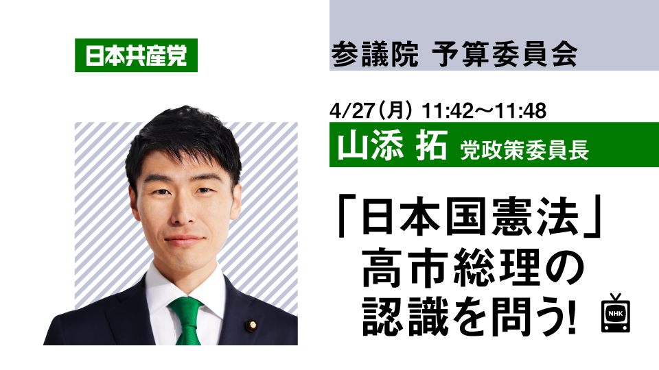 4/27(月)山添拓 党政策委員長・参院議員が参院予算委員会で、質問に立ちます。