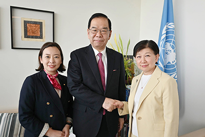 志位氏は最後に、「私の要請は、すべてのNPT締約国が賛成して採択された内容を再確認・履行することを求めるものですが、核兵器を巡る安全保障環境が悪化するなかで、これらの内容を再確認する成果文書が発出されるならば、きわめて重要な積極的意義をもつことになります」と強調しました。吉良よし子参院議員は、「非核三原則見直しなどへの不安が広がる一方、被爆者の方々をはじめNPT会議の成功への期待があります。ぜひ成果文書を実らせてほしい」と語りました。