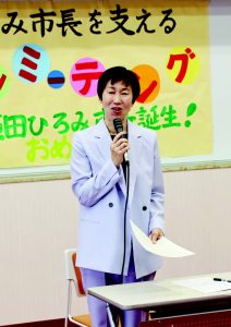 清瀬市で18日、市長選(3月29日投票)で誕生した原田ひろみ市長を市民の力で支えようというタウンミーティングが開かれました。市長選で原田氏を擁立した「市民とともに市政を変えるきよせの会」が開いたもの。新市長と力を合わせ、清瀬市を良くしていこうという熱気に包まれました。