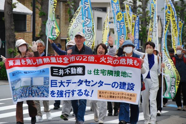 東京都日野市の日野自動車工場跡地で三井不動産が高さ72㍍もの巨大データデンター(DC)の建設を計画している問題で、近隣住民らが25日、市の適合通知の撤回と、住民との協議を求める集会とパレードを行いました。約70人が参加(主催者発表)。パレードで「巨大データセンター建設強行反対」「守ろう市民の暮らしと環境」などどコールすると、沿道から手を振って応える人がいました。