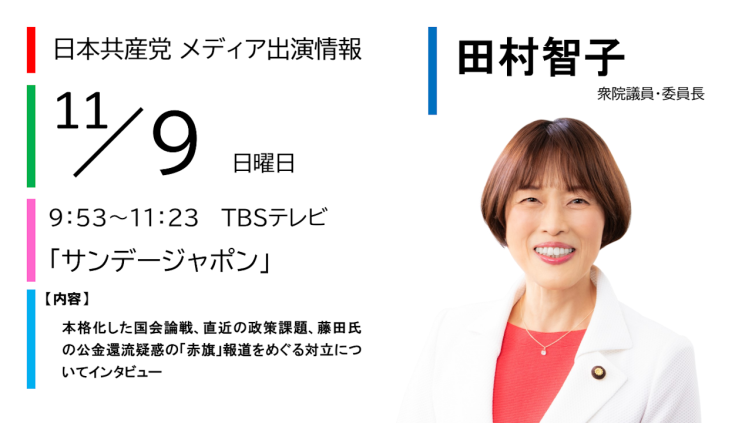 お知らせ 【メディア出演】11/9(日)田村智子委員長がTBS「サンデージャポン」に出演します